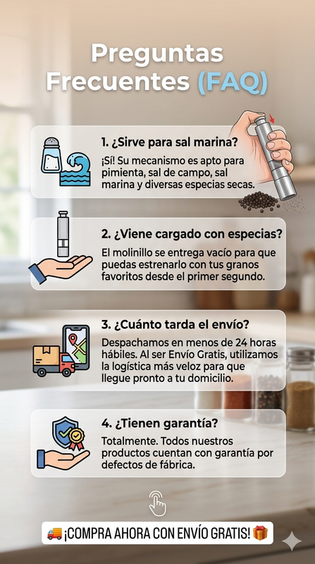 Imagina tu cocina transformada 🥂 Ya sea para una cena romántica o un asado con amigos, este molinillo aporta ese aire de distinción que tu mesa merece. Olvida los plásticos descartables y pásate a un accesorio que combina con tu estilo de vida moderno y organizado.